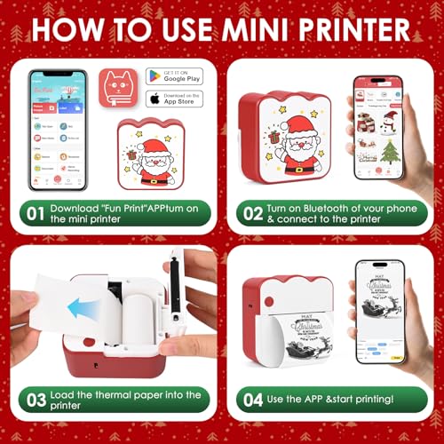| Features | 【Bluetooth-Sofortverbindungsdrucker】: Der Drucker verwendet die ''Fun print''-APP-Bluetooth-Verbindung, es sind keine weiteren komplizierten Vorgänge erforderlich. Befolgen Sie einfach die Verbindungsanweisungen, um schnell eine Verbindung zu einem beliebigen Smartphone herzustellen, und Sie können Ihre Reise zum drahtlosen Schwarzweißdruck beginnen Um das Wachstum Ihres Kindes und die Bedeutung des Reisens festzuhalten, spüren Sie die Freude an schönen Erinnerungen., 【Thermal Inkless Printing Technology】: Der Weihnachten Bluetooth-Thermodrucker verwendet die Thermodrucktechnologie, verwendet keine Tinte, ist bequemer zu bedienen, umweltfreundlicher, unterhaltsamer und praktischer. Thermische Schwarz-Weiß-Druckbilder, damit Ihre Schwarz-Weiß-Fotos elegant und cool aussehen. Hinweis: Wenn der Druck nach mehrmaligem Gebrauch des Fotodruckers nicht klar ist, können Sie den Laserbalken des Druckers mit Alkohol abwischen (der Laserbalken befindet sich im Papierladefach)., 【Ausgezeichnete Leistung Bluetooth-Drucker】: Tragbarer Drucker mit super Druckqualität, 200 DPI hoher Auflösung, eingebautem wiederaufladbarem 1200-mAh-Li-Ion-Akku mit hoher Dichte, längerer Akkulaufzeit, hochwertiger Fotodrucker, um schöne Momente besser festzuhalten. Nachdem Sie diese wunderschöne Landschaft gesehen haben, können Sie die verlorene Schönheit in klaren Bildern wiederentdecken., 【Netter und praktischer Sofortdrucker】: Mini-Smartphone-Foto-Thermodrucker, elegantes und einfaches, aber niedliches Aussehen, kompakte und leichte Körpergröße, kann auf Reisen in eine Tasche oder Tasche gesteckt werden, Sie können ihn mitnehmen, einfach jedes Sie aufzeichnen etwas loggen möchte.Unser Weihnachtsdrucker ist ein tolles Weihnachtsgeschenk für Kinder. Die festliche Weihnachtsstimmung wird Ihre Familie umgeben., 【Der beste Mini-Fotodrucker für Geschenke】: Er unterstützt eine Vielzahl von funktionalen Anwendungen und kann Fotos, Aufkleber, Arbeitspläne usw. drucken. Weihnachten Mini Drucker Er ist eine ausgezeichnete Geschenkauswahl für Studenten, Paare, Familienmitglieder, Freunde usw. und ein kleiner Assistent, um ein gutes Leben aufzunehmen! |