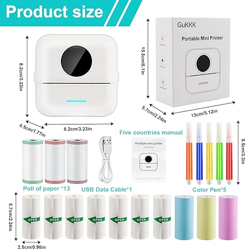 GuKKK Mini Drucker, Mobiler Fotodrucker, Tragbarer, Wireless Thermodrucker, mit 13 Rollen Druckerpapie und 5 Buntstifte, für Lernhilfe,Lernnotizen,Journal,Notizen,Liste