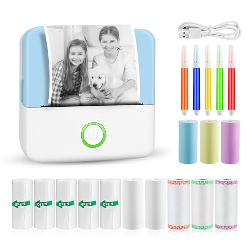 GuKKK Mini Drucker, Mobiler Fotodrucker, Tragbarer Mini Fotodrucker, Wireless Fotodrucker Thermodrucker mit 13 Rollen Druckerpapie und 6 Buntstifte, Smartphone Bluetooth, für Liste, Journal