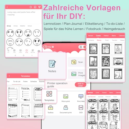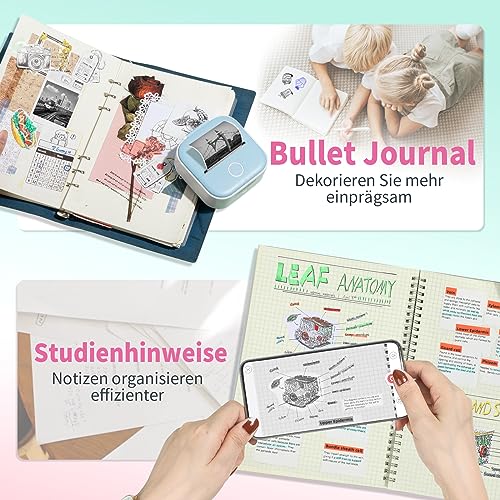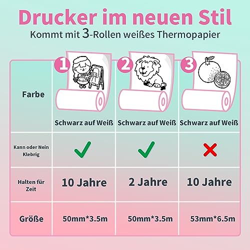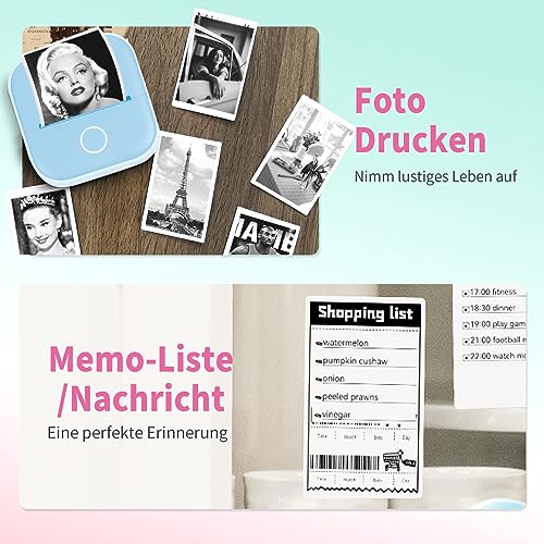 | Features | Minidrucker mit 3 Papierrollen – Der Minidrucker T02 wird mit 3 Papierrollen geliefert, ist also preiswerter und ermöglicht es Ihnen, den Spaß sofort zu genießen. Der kleine Drucker unterstützt außerdem fast 50 Arten von Thermopapier, was das Drucken interessanter macht und für verschiedene Zwecke geeignet ist, Einfach zu bedienen – Der Bluetooth-Drucker ist einfach zu bedienen. Laden Sie die App herunter, verbinden Sie Ihren Taschendrucker mit der App und schon können Sie drucken. Der tragbare Drucker unterstützt sowohl Android als auch iOS, so dass Sie sich keine Sorgen um die Kompatibilität machen müssen. Die App bietet außerdem viele lustige Vorlagen, die Sie erkunden können! Viel Spaß beim Drucken, Große Auswahl an Geschenken – der tragbare Mini-Drucker ist ein tolles Geschenk für den Schulanfang, Halloween, Thanksgiving, Weihnachten, Neujahr usw. Der Mini-Aufkleberdrucker hat eine exquisite Verpackung und eine leistungsstarke, lustige Funktion, die Leute, die den Mini-Thermodrucker geschenkt bekommen, werden glücklich sein, Geeignet für verschiedene Verwendungszwecke – mit diesem Mini-Drucker können Sie Memos, To-Do-Listen, Studiennotizen, Bullet Journal, Bilder usw. für Studium, Aufzeichnung, Geschäft, Markierung und Unterricht drucken. Der Mini-Drucker eignet sich für Studenten, Kinder, Lehrer, Mütter oder andere Personen, Tragbar, im Lieferumfang enthalten, wiederaufladbar – Sie können den Handydrucker in Ihrer Tasche mitnehmen und alles jederzeit und überall ausdrucken. Der kleine Drucker ist wiederaufladbar, so dass Sie sich keine Gedanken über das Ladeproblem machen müssen. Die Thermotechnologie bedeutet, dass Sie keine Tinte nachfüllen müssen, sondern nur Thermopapier brauchen, und dann können Sie drucken |