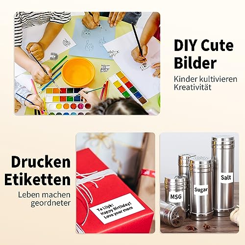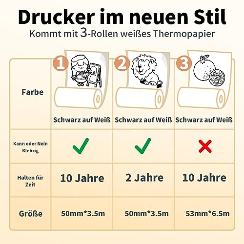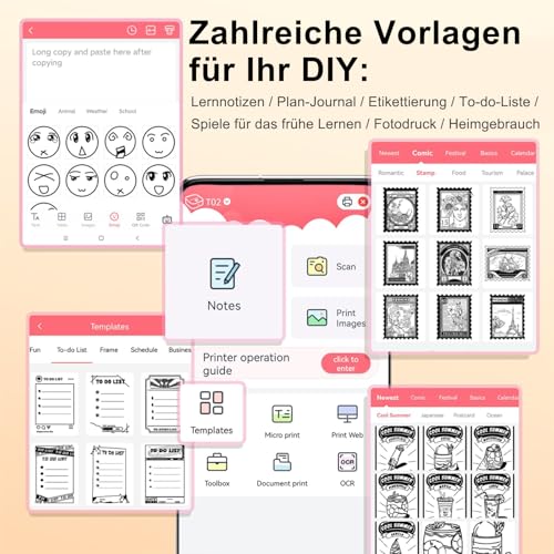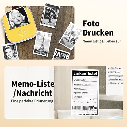 | Features | Minidrucker mit 3 Papierrollen – Der Minidrucker T02 wird mit 3 Papierrollen geliefert, ist also preiswerter und ermöglicht es Ihnen, den Spaß sofort zu genießen. Der kleine Drucker unterstützt außerdem fast 50 Arten von Thermopapier, was das Drucken interessanter macht und für verschiedene Zwecke geeignet ist, Geeignet für verschiedene Verwendungszwecke – mit diesem Mini-Drucker können Sie Memos, To-Do-Listen, Studiennotizen, Bullet Journal, Bilder usw. für Studium, Aufzeichnung, Geschäft, Markierung und Unterricht drucken. Der Mini-Drucker eignet sich für Studenten, Kinder, Lehrer, Mütter oder andere Personen, Große Auswahl an Geschenken – der tragbare Mini-Drucker ist ein tolles Geschenk für den Schulanfang, Halloween, Thanksgiving, Weihnachten, Neujahr usw. Der Mini-Aufkleberdrucker hat eine exquisite Verpackung und eine leistungsstarke, lustige Funktion, die Leute, die den Mini-Thermodrucker geschenkt bekommen, werden glücklich sein, Einfach zu bedienen – Der Bluetooth-Drucker ist einfach zu bedienen. Laden Sie die App herunter, verbinden Sie Ihren Taschendrucker mit der App und schon können Sie drucken. Der tragbare Drucker unterstützt sowohl Android als auch iOS, so dass Sie sich keine Sorgen um die Kompatibilität machen müssen. Die App bietet außerdem viele lustige Vorlagen, die Sie erkunden können! Viel Spaß beim Drucken, Tragbar, im Lieferumfang enthalten, wiederaufladbar – Sie können den Handydrucker in Ihrer Tasche mitnehmen und alles jederzeit und überall ausdrucken. Der kleine Drucker ist wiederaufladbar, so dass Sie sich keine Gedanken über das Ladeproblem machen müssen. Die Thermotechnologie bedeutet, dass Sie keine Tinte nachfüllen müssen, sondern nur Thermopapier brauchen, und dann können Sie drucken |