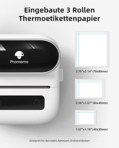 | Features | Thermo-Etikettendrucker: Nie wieder Tinte, Toner und Farbband benötigen Dieser Barcode-Etikettendrucker druckt mit Thermotechnologie, was bedeutet, dass Sie nur Etiketten nachfüllen müssen, der Thermo-Etikettendrucker wird mit 3 Rollen Etiketten geliefert (1 Roll 40x30mm Etikett, 1 Roll 60x40mm Etikett, 1 Roll 70x80mmEtikett), Kostenlose Smartphone-App – Das Forschungs- und Entwicklungsteam von Phomemo erstellt für Sie die Print Master APP mit einer Vielzahl integrierter Funktionen. Verwendung mit einem Klick: Text, Bilder, Barcodes, QR-Codes, OCR, Formulare, Hunderte von Symbolen und viele vorgefertigte Vorlagen für den gewerblichen und privaten Gebrauch, um Ihre Druckdaten einfach zu speichern und zu finden. Verbessern Sie Ihre Effizienz, Lange Akkulaufzeit – Phomemo M220 Etikettendrucker Upgrade 2200 mAh Akku bietet bis zu 36 Rollen kontinuierlichen Druck, neu hinzugefügter Auto-Sleep-Modus, der den Stromverbrauch um 25 % reduzieren und die Nutzungsdauer um 2-3 Stunden verlängern kann(Input: 5V), Hohe Kompatibilität: Der Phomemo M220 Etikettendrucker unterstützt nicht nur iOS und Android-Mobiltelefone über eine Bluetooth-Verbindung, sondern unterstützt auch eine USB-Verbindung für MAC und Windows 10. (WARNUNG: Für eine bessere Erfahrung sehen Sie sich bitte unbedingt das Software-Installations-Tutorial an auf der Seite), Weit verbreitete Verwendung: Der M220 3,14-Zoll-Bluetooth-Etikettendrucker bietet eine Vielzahl von Verwendungsmöglichkeiten und kreativen Möglichkeiten. Genießen Sie es, überall etwas zu etikettieren, wie kleine Unternehmen: Kleidung, Kunsthandwerk, Einzelhandel, Schmuck usw. Etikettieren von Adresse, Barcode, Versand, Preis, Datum , Zutaten, Logos, Etiketten für Produkte Sparen Sie viel Zeit für handschriftliche Etiketten, sodass Sie sich mehr auf Ihre kleinen Unternehmen konzentrieren können |