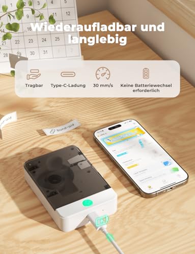 Mit einem Akku von 1000 mAh bietet der Drucker eine robuste Laufzeit, die für die meisten Anwendungen mehr als ausreichend ist. Der Akku lässt sich bequem über USB aufladen, was eine einfache Handhabung ermöglicht.