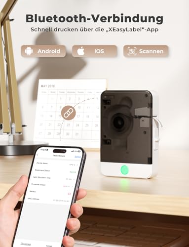 | Features | Warum Etiketten? Ordnung muss sein! Mit Kennzeichnungen finden Sie alles schnell,kein langes Suchen mehr! Vermeiden Sie Verwechslungen und behalten Sie den Überblick über abgelaufene Lebensmittel oder Medikamente. Perfekt für Schul zu Hause Büro Küche, DIY mit Etikettendrucker: 203 dpi, individuelle Etiketten 800+ Vorlagen per App. Mit Kalibrierungsfunktion. Halten Sie den etikettendrucker stabil, um Schriftverschiebungen zu vermeiden. Bitte testen Sie 1-2 Etiketten, bevor Sie in größeren Mengen drucken, Beschriftungsgerät Selbstklebend: Enthält 1 Rolle durchgehendes Etikettenrolle(15 mm breit, φ45 mm,8m länge). Bluetooth Konnektivität für iOS und Android. Mit 1000 mAh Akku, der per USB aufgeladen wird. ideal für die gesamte Haushaltsorganisation, Etikettendrucker Bluetooth: Keine Tinte nötig sparen Sie Kosten! Thermopapierdruck unterstützt sowohl durchgehende als auch segmentierte Etiketten. Wasser-, schmutz-, fett- und kratzfest ohne Kleberückstände. Perfekt für Küche, Haushalt und mehr, Eingebautes labelsschneider: kinderfreundliches Design. Halbtransparentes Sichtfenster zur Überprüfung des Papierstands. passend allen 15x45mm und 8m länge Etikettenrollen.Unterstützt durchgehende und segmentierte Etiketten,wählbar je nach Vorlage |