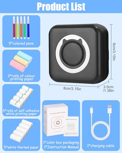 - Lieferumfang: Drucker, 5 Rollen Thermopapier, 5 Rollen selbstklebendes Thermopapier, farbiges Thermopapier und 5 Farbstifte.