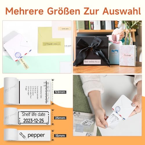 Der Drucker ist mit mehreren Papierrollengrößen kompatibel, was dir die Flexibilität gibt, verschiedene Etikettenformate zu erstellen. Egal ob für Notizen, To-Do-Listen oder kreative Projekte, der Drucker ist vielseitig einsetzbar.