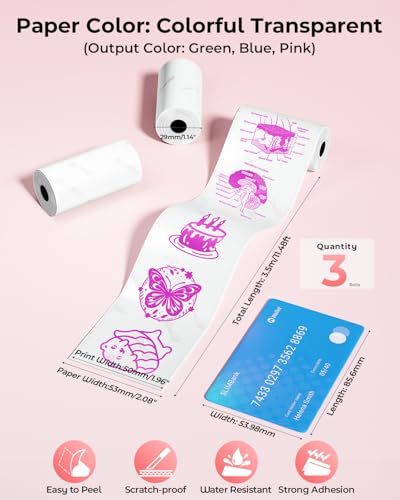 Memoking T02 Farbiges Aufkleberpapier, bunt, transparent, klebrig, T02 Mini-Drucker-Aufkleberpapier, Nachfüllpackung, 50 mm x 3,5 m, hält 20 Jahre, für Tagebuch, Foto, Studium, Notizen