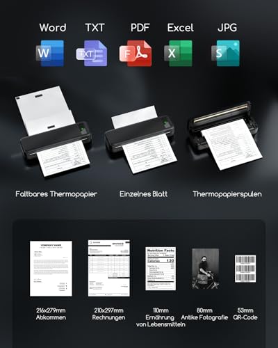 | Features | 【A285M (mit Geschenkbox) Thermodrucker】Hochkompatibilität: Der A285M unterstützt die Bluetooth – Verbindung mit Smartphones und Tablets, auf denen iOS 13 oder eine neuere Version sowie Android 7 oder höher läuft. Bei Computern kann eine USB – C – Verbindung hergestellt werden, und er ist kompatibel mit Windows 7 oder neuer, Mac OS 10.14 oder höher, Google, Linux. Bitte beachten Sie, dass die Bluetooth – Verbindung bei Computern nicht unterstützt wird, Thermal Printer [Mehrgrößen-Druck]: Der drahtlose tragbare Drucker hat einen eingebauten Papierbehälter und unterstützt Thermorollenpapier, kontinuierliches und einzelnes Thermopapier, Thermosensible Aufkleber. Dieser kleine drahtlose Drucker unterstützt auch 5 Größen von Thermopapier: 8,5“ X 11” US Letter, A4, 4,33'' (110 mm), 3,14'' (80 mm), 2,08'' (53 mm) Breite Thermopapier und kann die meisten Ihrer Bedürfnisse decken, Portable Drucker für Reisen [Kompakt und platzsparend]: Dieser tragbare Drucker verfügt über eine eingebaut 2600 mAh wiederaufladbare Batterie und kann pro Ladung 160 Blätter 8,5'' x 11'' Thermopapier ausdrucken. Er wiegt nur 1,5 Pfund und hat eine kleine Größe. Dieser inkosame tragbare Drucker passt bequem in einen Rucksack oder Briefkasten! Ideal für das mobile Drucken während Geschäftsreisen, im Auto oder LKW, in kleinen Büros, auf Baustellen, in der Schule und zu Hause. Sie können Dokumente, Verträge, Rechnungen und Bordkarten zu jeder Zeit und an jedem Ort ausdrucken, Inkless Printer [Kosteneffektiv und Inkosame Druckung]: Der Bluetooth-Mobile Drucker verwendet die fortschrittliche Thermotechnologie. Während des Druckens werden keine Tinte, Toner oder Bänder benötigt, und es gibt keine Probleme mit Verstopfungen und Reinigungen! Sie müssen nur Thermopapier verwenden; normales Kopierpapier wird nicht unterstützt, Drahtloser Bluetooth Drucker [Hohe Kompatibilität]: Der tragbare Thermodrucker ist kompatibel mit iPhone, Android-Handy, iPad, Tablet via Bluetooth. Drucken Sie Dokumente, Fotos, Webseiten von Ihrem Handy zu jeder Zeit und an jedem Ort. Sie können auch das USB-C-Kabel verwenden, um Ihren Laptop und Ihren Computer für das Drucken anzuschließen. (Hinweis: Laptop und Computer funktionieren nur mit einer USB-Verbindung und erfordern zunächst das Herunterladen des Treibers.), Mobile Drucker [Hochwertiger Druck]: Der kompakte Drucker ist mit 300 DPI klarer Druckausstattung ausgestattet und ist für Menschen konzipiert, die außerhalb arbeiten. Ein drahtloser ohne tinte tragbare Drucker, der ideal ist für mobile Notare, Lkw-Fahrer, Geschäftsreisende, Büroangestellte, Lehrer und Schüler. Hinweis: Unterstützt nur Schwarz-Weiß-Druck |