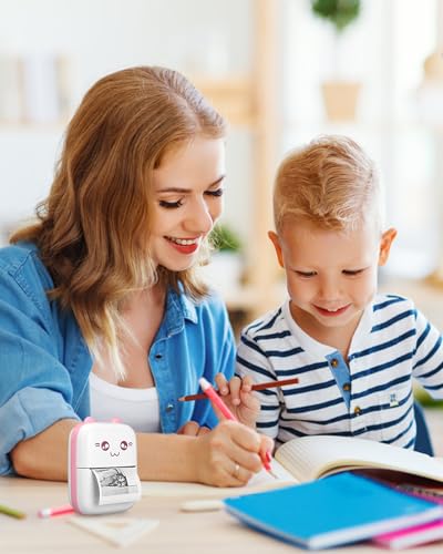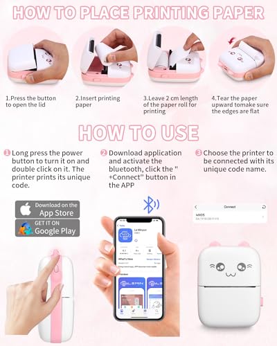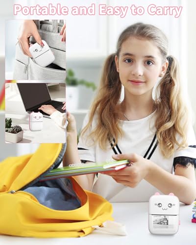 Zounin Mini Drucker, Tragbarer Fotodrucker, Smartphone Bluetooth Drucker mit 13 Rollen Papier und 5 Farben DIY Stift, Wireless Fotodrucker Thermodrucker für tägliche Notizen, Bürohilfe, rosa Katze